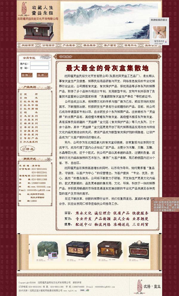 沈陽福靈益民俗文化開發(fā)有限公司(系原沈陽靈益工藝品廠),是長期從事骨灰盒生產(chǎn)及銷售、殯葬民俗用品研制與開發(fā)、網(wǎng)絡信息服務的專業(yè)化殯葬行業(yè)企業(yè)。公司擁有骨灰盒、骨灰保護產(chǎn)品、祭祀用品等多種系列的殯葬產(chǎn)品,取得了多個品種外觀設計專利、實用新型專利,發(fā)明專利并獲得了質(zhì)量技術監(jiān)督局認證的國家標準 “質(zhì)量跟蹤骨灰盒生產(chǎn)單位”等權威證書。